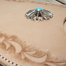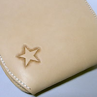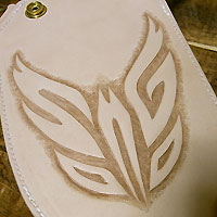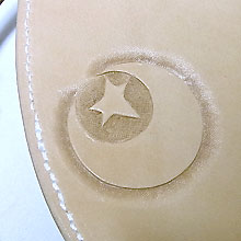 専用のナイフで革に切込みを入れ、その周りを色々な形状の刻印棒でたたいていくと革に凹凸が出てきます。