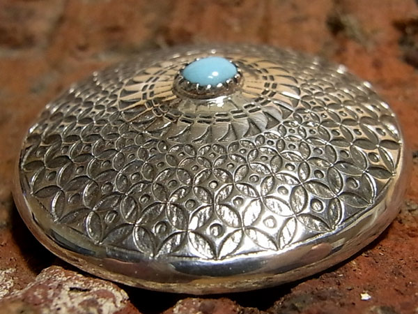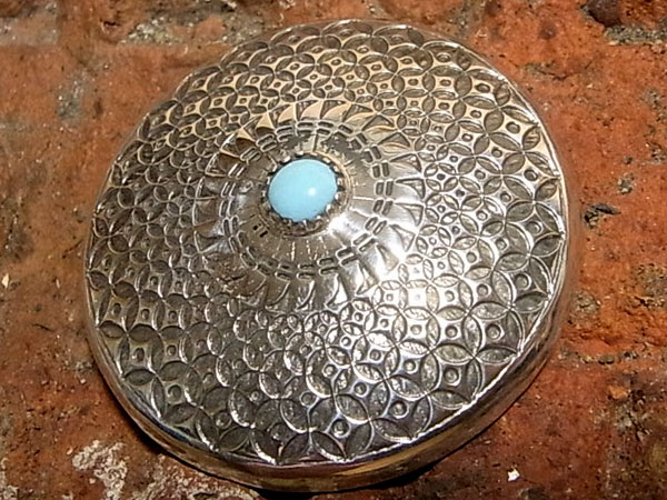 | 品番 C‐071 サイズ 37(mm) 価格 \13,500 (税込\14,850) トルコ石つき シルバー950 ※ターコイズ(トルコ石)は、天然のものが付属しておりますので、 色合い、模様など個体差がございます。 |