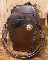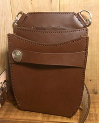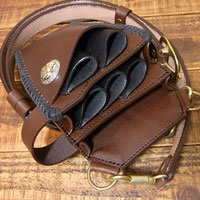 オーダー708-053 革種:スタンダードレザー 革色:【CB】チョコブラウン 【BK】ブラック 仕様:左利き用に左右反転 シザー5丁差し 装飾:別注ライオンコンチョ 前部ダブルステッチ ブラスパーツ ベース:708-035