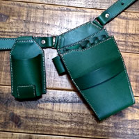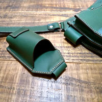 オーダー708-063 革種:スタンダードレザー 革色:【G】グリーン 仕様:ベルト2本タイプ固定 ダッカールホルダー変更 ブラシホルダー追加 サイドケース追加