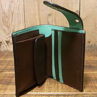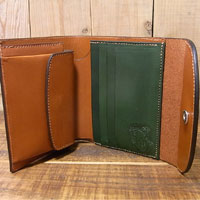 オーダー621 革種:スタンダードレザー 革色:【B】ブラウン 【C-G】手染めグリーン 仕様:かぶせつきハーフウォレット 装飾:かえるのカービング