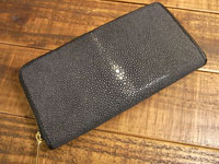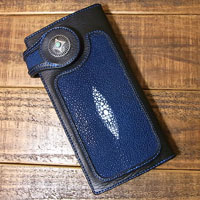 オーダー619 革種:スタンダードレザー 革色:【BK】ブラック 革種:スティングレー 革色:ブルー 仕様:フラップ付きロングウォレット 装飾:コンチョC-057