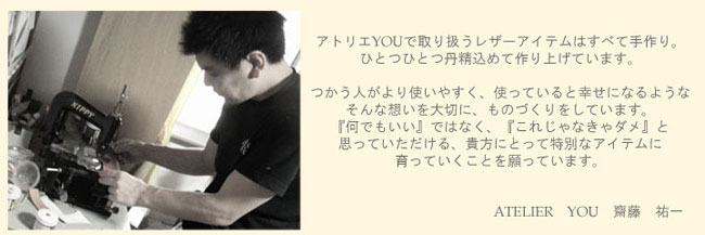 オーダーメイドレザーアイテム専門店アトリエユウ。シザーケース、レザーウォレット(革財布)をお好みに合わせてひとつひとつハンドメイドで製作致します。 |