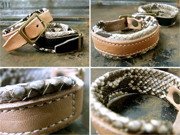 芯のレザーに丁寧にパイソンを巻きつけ、更にその上にオイルレザーの